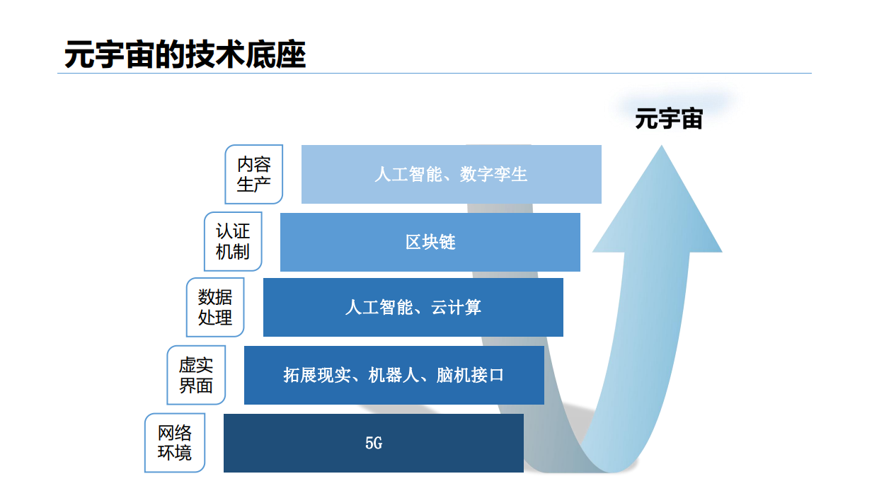 元宇宙涉及到非常多的技术,包括人工智能、数字孪生、区块链、云计算、拓展现实、机器人、脑机接口、5G等,元宇宙的生态版图中有底层技术支撑、前端设备平台和场景内容入口。元宇宙有三个属性,一是包括时间和空间的时空性;二是包括虚拟人、自然人、机器人的人机性;三是基于区块链所产生的经济增值性。