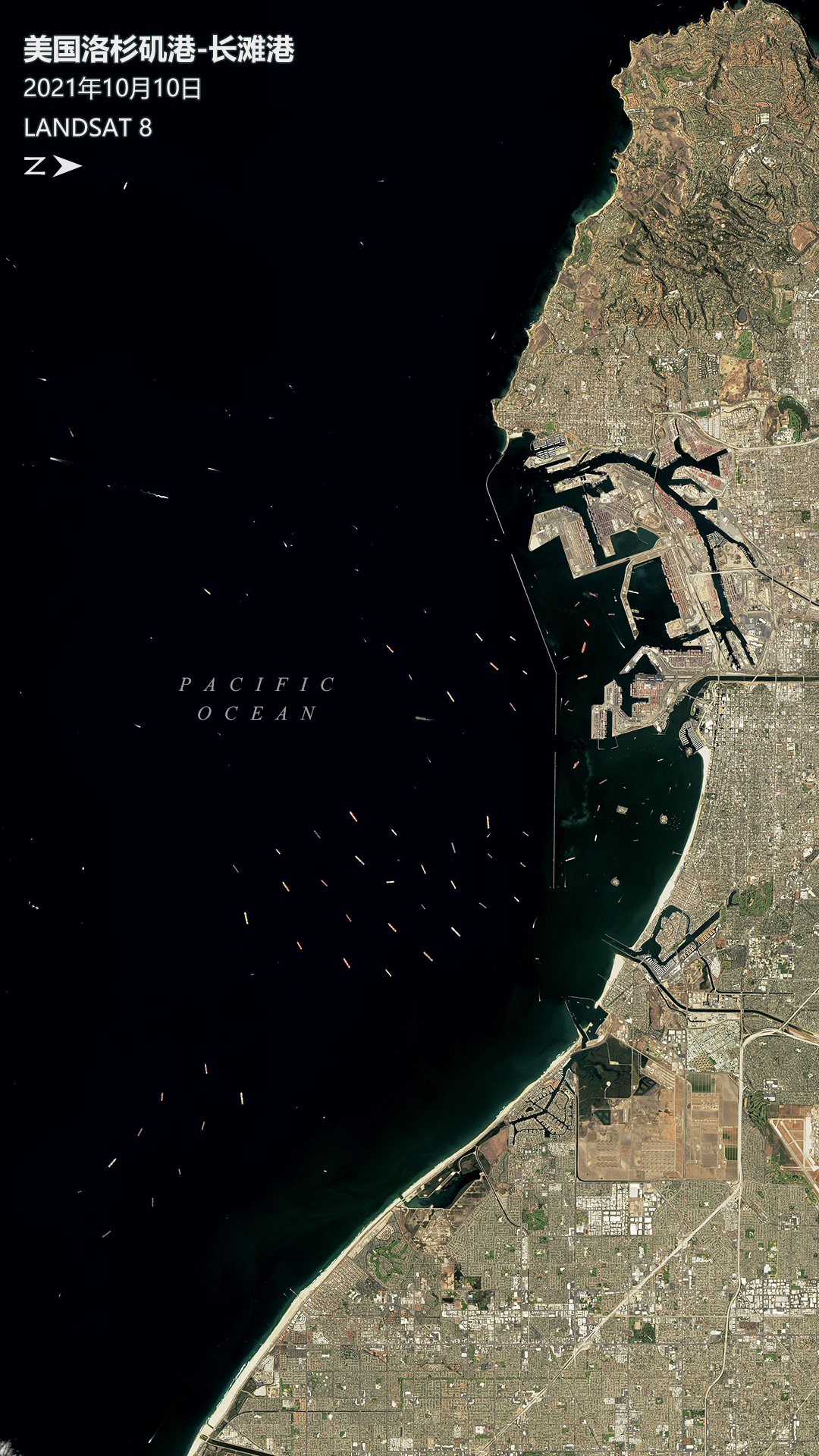 ▲图为2021年10月10日,美国洛杉矶港和长滩港港口货船大量积压。卫星影像来源:NASA