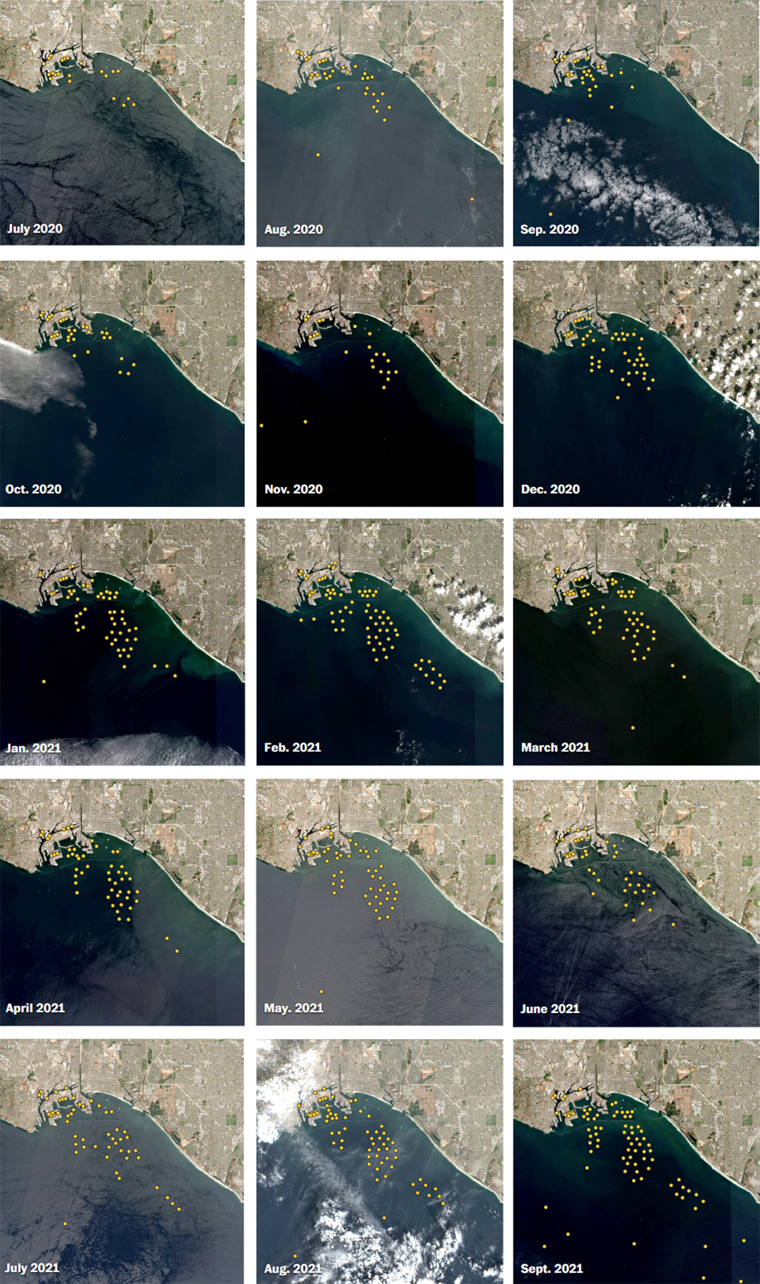 ▲图为2019年10月到2021年9月美国洛杉矶港和长滩港港口货船数量变化。卫星影像来源:SENTINEL-2