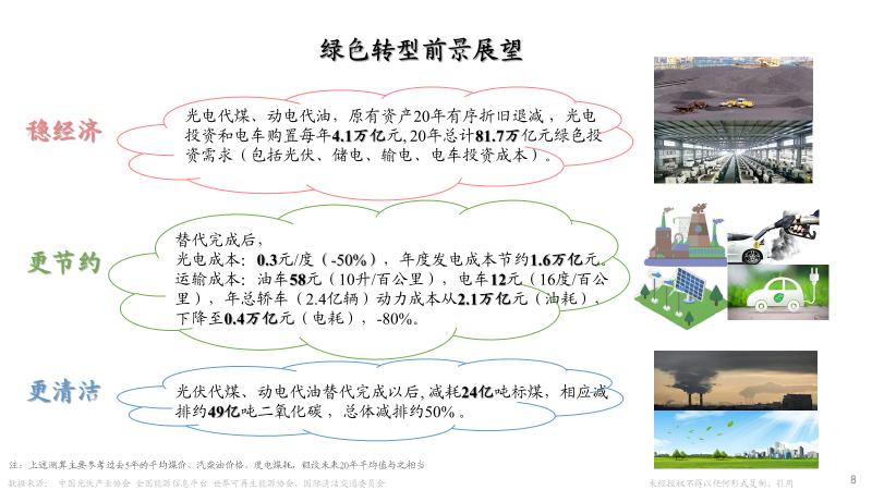 最后总结一下,绿色技术进步推动经济转型,是可能实现稳经济的。每年把光电投资与电车购置等全部加在一起,年均约4万亿元更新型投资与消费,20年总共81.7万亿。而且在替代完成后,实际运营时有望更节约,无论从光电发电来说,还是民用汽车运输都更便宜,还不要说这是在更清洁基础上实现的。如果我们有效解决了储电、输电等问题,减少煤电发电所需的24亿煤,也就相当于没有了跟它相关的49亿吨二氧化碳排放,这也会有效地助力双碳目标的实现。所以推动绿色技术转型,将促进稳定经济增长。我今天就讲这么多,谢谢大家!