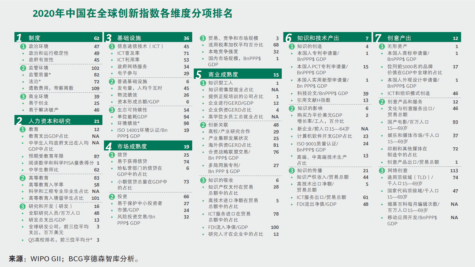 中国在全球创新指数的排名,是由世界知识产权组织和康奈尔大学联合发布的。2020年,我们在知识和技术产出排名第7,在创意产出排名第12,商业成熟度排名第15……确实在很多领域有很大的进步。但在有些方面,在科技创新的制度安排、在基础设施方面仍然有一定的差距,这就是目前中国科技创新的现状。