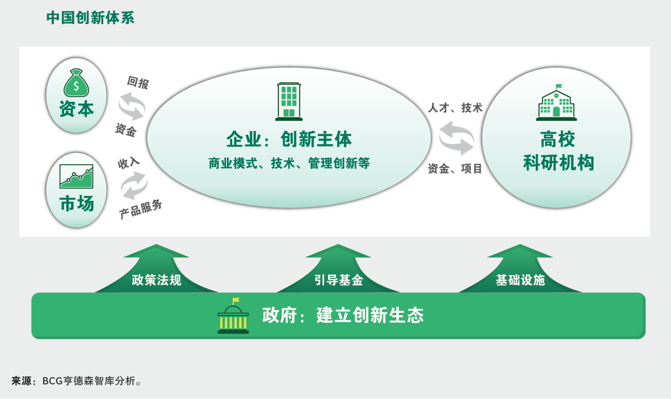第二,我想谈谈中国创新发展的新格局。经过40年的改革开放,中国的创新体系实现了跨越性发展。我们过去讲国家创新体系,高校科研机构可能是在核心,但现在企业是创新的主体,这就是中国从过去的国家科研体系转型到今天的国家创新体系。这里面高校、科研机构发挥着很重要的作用,提供人才、提供技术、提供很多支持。另外,市场和资本也为企业的创新提供源源不断的支撑。政府的作用是在底下建立一个创新生态,引导基金、政策法规、基础设施等等。
