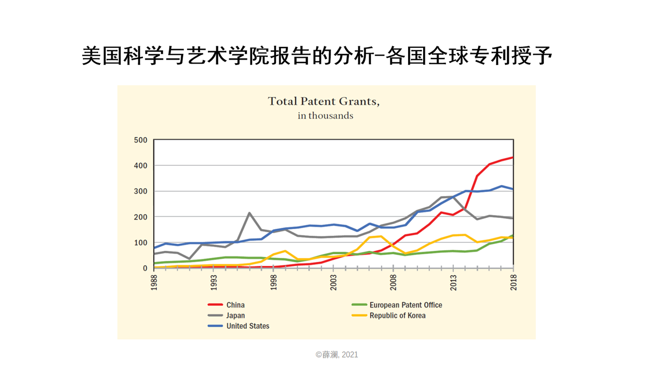 我们可以以两个角度来衡量,一个是科技论文。红线是中国在科学工程方面英文文章的发表数量,在持续不断地增长。到了2017年已经超过了美国,现在我们的数量已经跟欧盟国家总和接近,可以看到我们国家的科技产出的快速增长。全球专利的授予,中国也已经超出全世界其他的国家,排名最高。