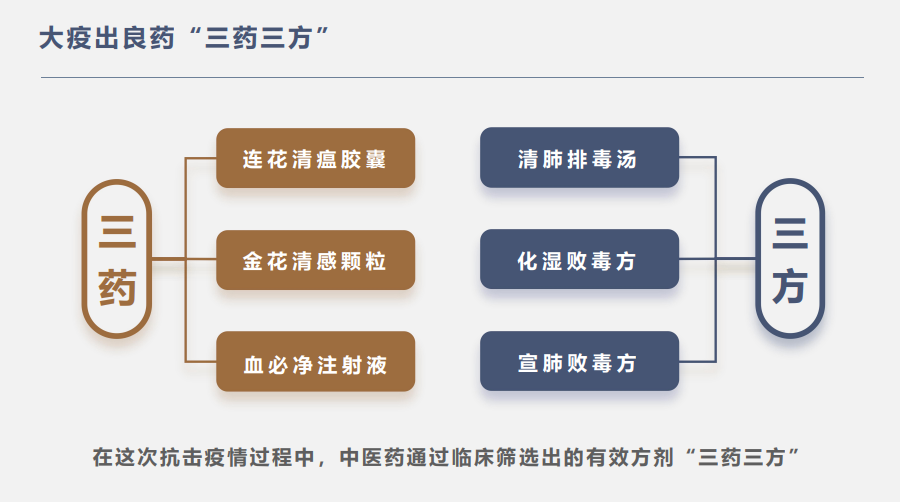 这次抗击新冠产生了“三药三方”。“三方”就是三个中药的处方,包括清肺排毒汤、化湿败毒方和宣肺败毒方,“三药”就是原来的老药新用,即莲花清温胶囊、金花清感颗粒和血必净注射液。
