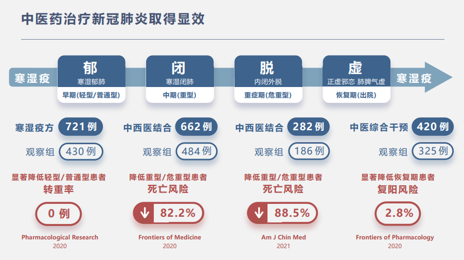 对于武汉当时第一批进入恢复期的病人,我们采用中医的综合干预疗法。这和没有用中医综合干预疗法的病人相比,复阳的风险大大降低。用中医综合干预的组,它的复阳率是2.8%,而没有用中医药干预的组,它的复阳率是15.8%。我们看到,采用寒湿疫方也就是“武汉抗疫1号方”治疗的721例轻型、普通型病人的转重率是0,而没有用中药的病人转重率是6.5%。