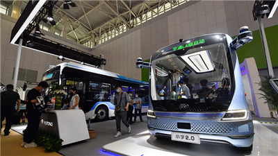 ▲这是在天津梅江会展中心拍摄的L4级自动驾驶巴士(2021年5月20日摄)。新华社记者孙凡越摄