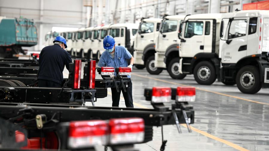 车间内,工作人员在组装新能源环卫车。新华社记者 李继伟 摄