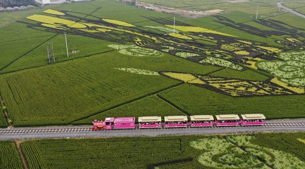 在河北省遵化市团瓢庄乡山里各庄村,游客乘坐小火车观赏“稻田画”。新华社发(刘满仓 摄)
