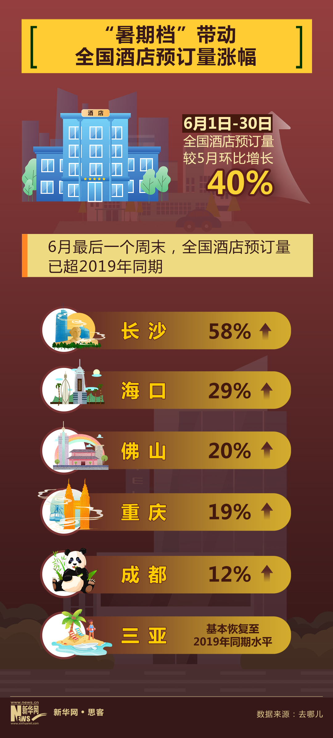 从去哪儿大数据看,暑期档带动酒店市场回暖。在去哪儿平台上,今年6月,全国酒店预订量较5月环比增长40%,在6月的最后一个周末,全国酒店预订量已经超过2019年同期。