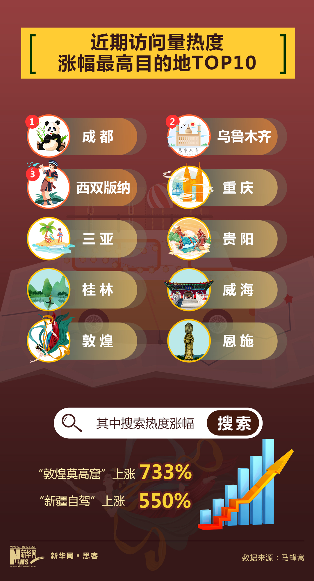 在携程平台上,多个热门旅行目的地的搜索量增长超300%。在马蜂窝平台,甘肃、新疆、云南、贵州等长线旅游目的地搜索量上涨明显,其中“敦煌莫高窟”搜索热度上涨733%,“新疆自驾”相关搜索热度上涨550%。瞬时访问量热度涨幅最高的目的地前十分别为:成都、乌鲁木齐、西双版纳、重庆、三亚、贵阳、桂林、威海、敦煌、恩施。
