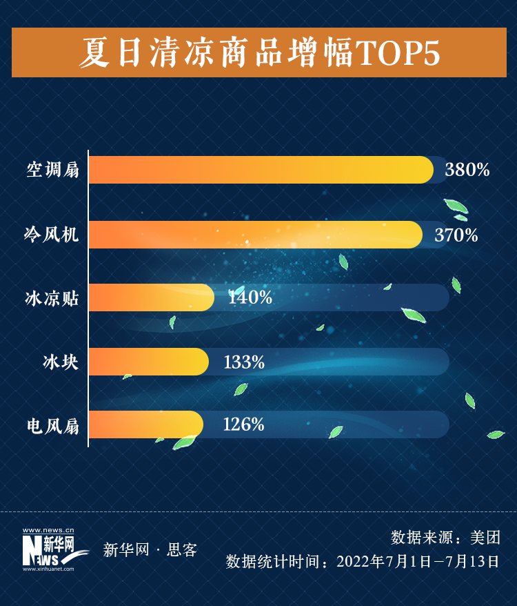 数据显示,7月1日至7月13日,美团平台“降温”搜索量同比增长220%。空调扇、冷风机的销量同比增长均超过370%。此外,美团平台的冰凉贴、冰块等清凉快消商品,同比增长也分别达140%、133%。