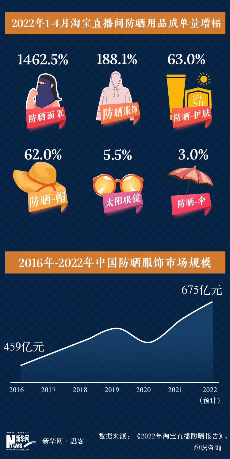 《2022年淘宝直播防晒报告》显示,2022年1—4月,防晒面罩成交增幅高达1462.5%,防晒衣和防晒护肤成交增幅分别为188.1%、63%。