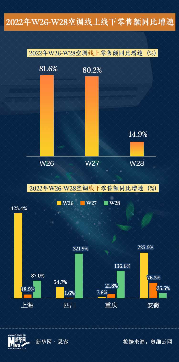 奥维云网数据显示,在“6·18”后的三周时间内,国内线上市场的空调零售额同比增幅分别为81.6%、80.2%、14.9%。线下市场方面,在高温区的上海、四川、重庆、安徽等地也实现3位数的增长。其中在2022年第26周(6月27日至7月3日),上海市和安徽省的空调线下零售额增速较上年同期达到了423.4%和225.9%。