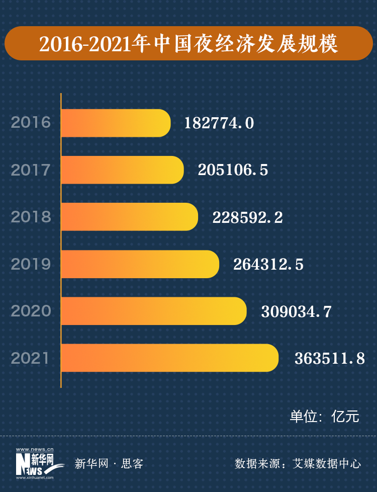 中国的“夜经济”规模有多大?根据商务部城市居民消费习惯调查报告显示,夜间时段已经承担起国内整个居民消费的60%。艾媒咨询的调查数据显示,自2016年以来,中国的“夜经济”规模快速增长。到2021年,总规模已达到36.35万亿元,艾媒咨询测算,2022年夜间经济增速将持续增加,有望突破40万亿元。