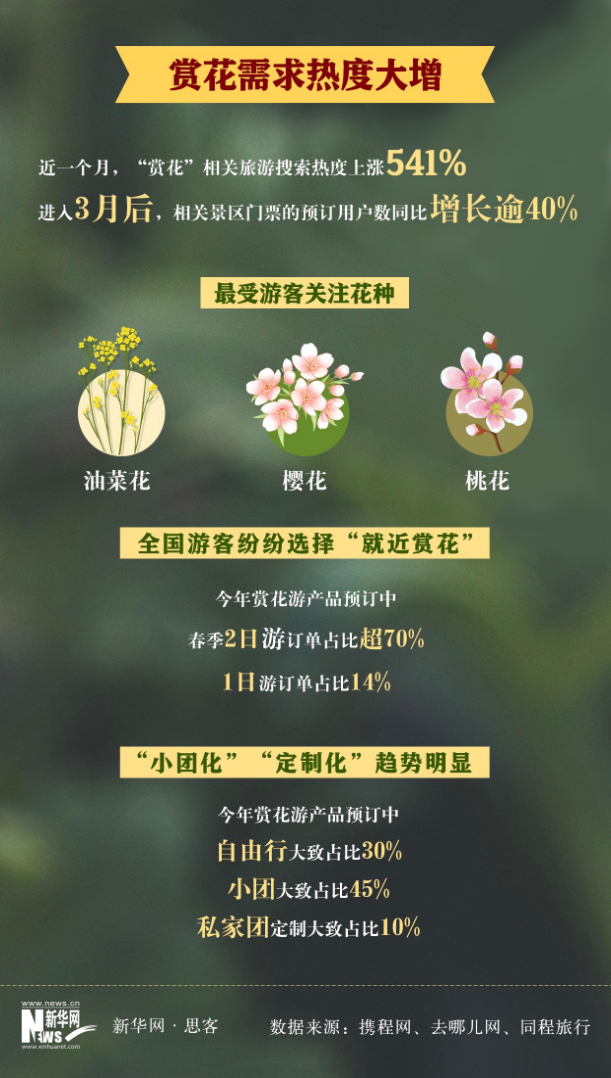 从出行时长看,大多数游客更钟情于“就近赏花”。携程数据显示,今年赏花游产品预订中,春季2日游订单占比超70%,1日游订单占比约为14%。也有不少游客动身坐上开往春天的列车去嗅一嗅花香。西藏林芝的桃花节在3月至4月举办,携程平台上,林芝度假产品订单量上涨迅速;近一个月“林芝”搜索热度环比增长超100%。全国最早的油菜花海所在地云南罗平,落“樱”缤纷的古都西安,近一个月搜索热度分别增长205%和85%。每年四月,牡丹花开洛阳城,3月至4月洛阳景区门票预定量同比增长逾30%。