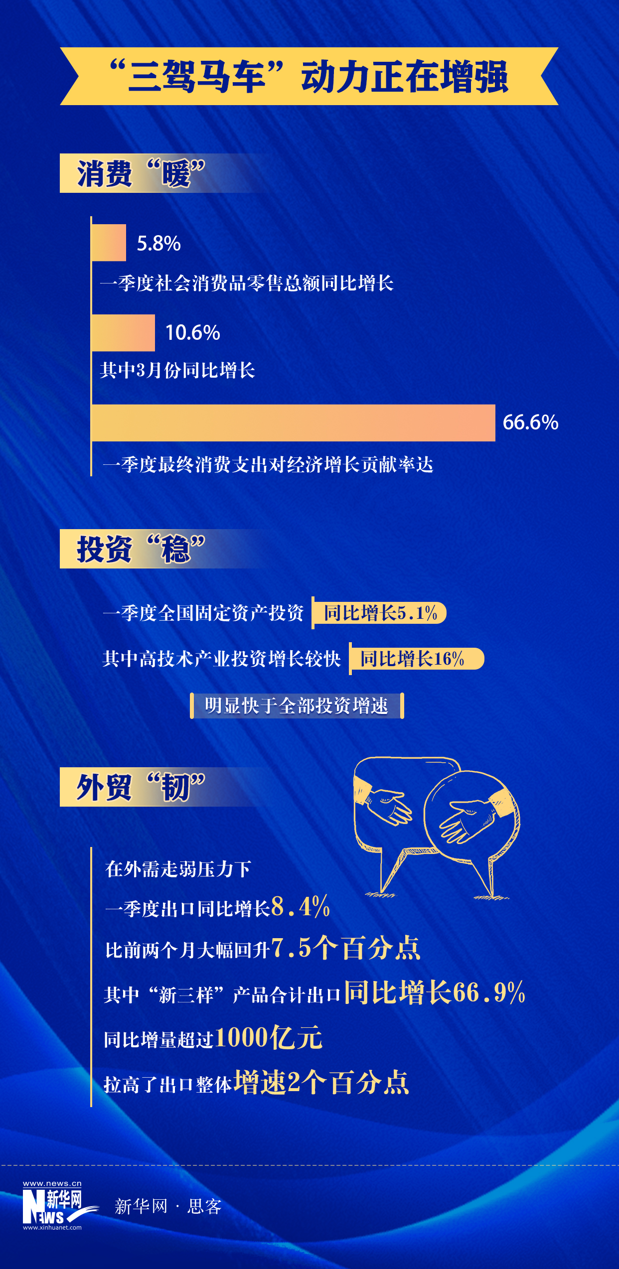 消费、投资、出口作为国民经济的“三驾马车”,一季度开足马力,为经济增长添动力。