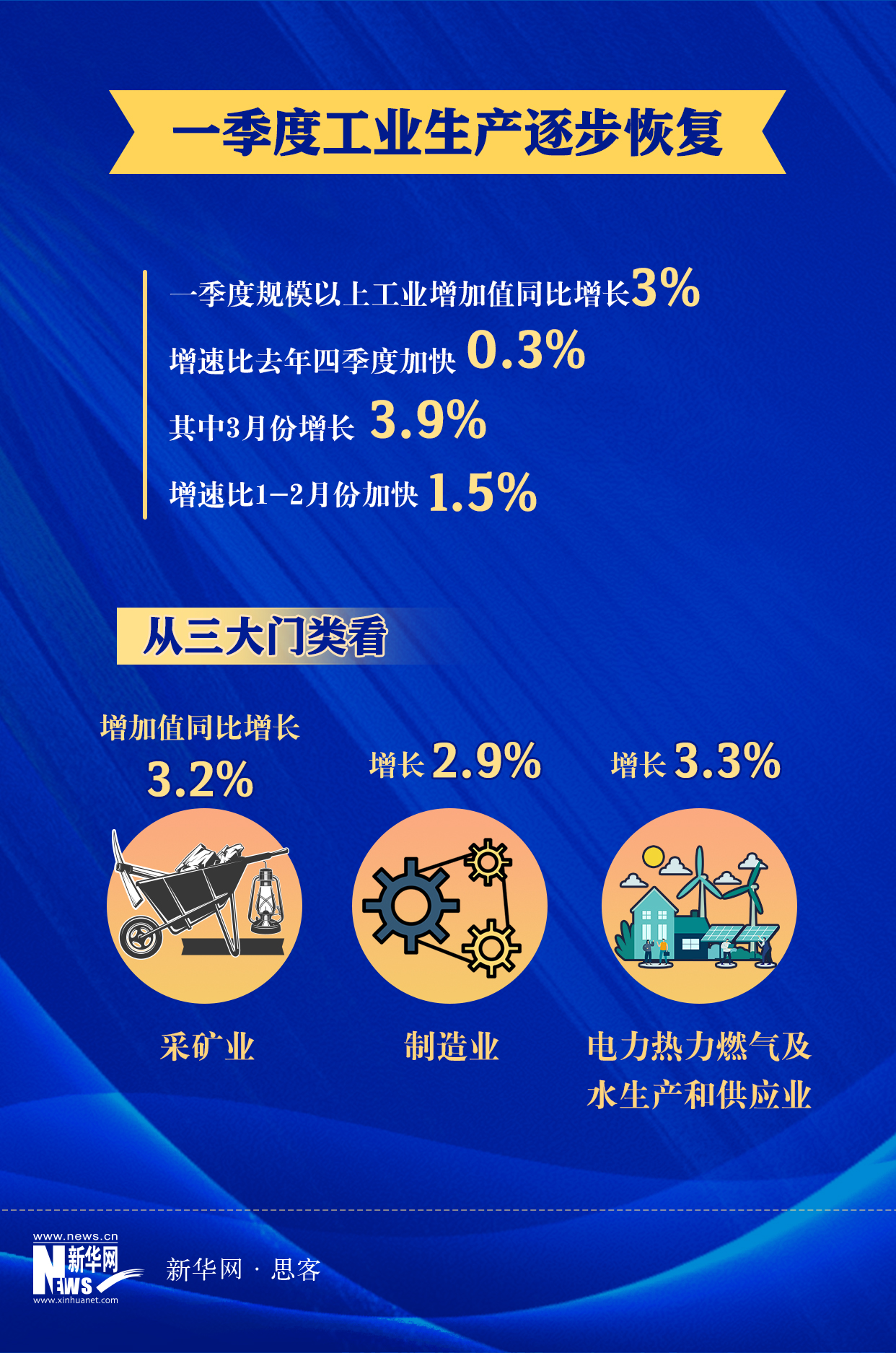 作为宏观经济的“压舱石”,工业经济增长为稳住经济大盘提供有力支撑。国家统计局新闻发言人付凌晖表示,一季度,稳增长政策持续显效,市场需求回暖,产业链供应链加快恢复,工业生产出现积极变化。中国信息协会常务理事、新经济研究院院长朱克力分析认为,在当前国际大宗商品价格高企、全球供应链持续受阻的背景下,能够实现工业生产加速增长实属不易,尽管仍然存在一些困难和挑战,但随着稳增长、促消费、加强基础设施建设、提高科技创新能力等一系列政策措施的逐步落实,中国经济有望进一步恢复和回升,并通过强化结构性调整与加快转型升级,实现质的有效提升和量的合理增长。