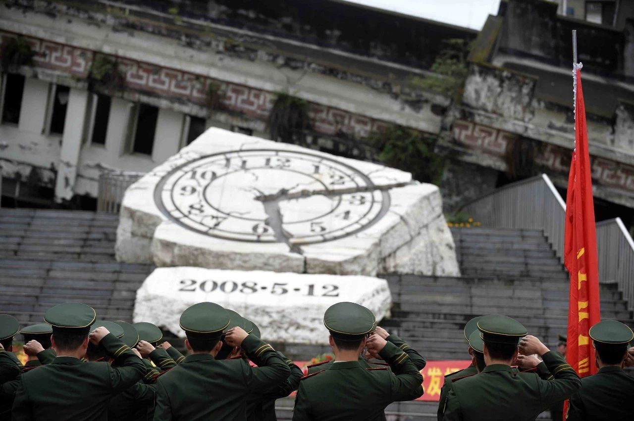 ▲2018年5月11日,汶川地震10周年,武警官兵在映秀的大地震遗址前进行入党宣誓。图片来源:央视新闻