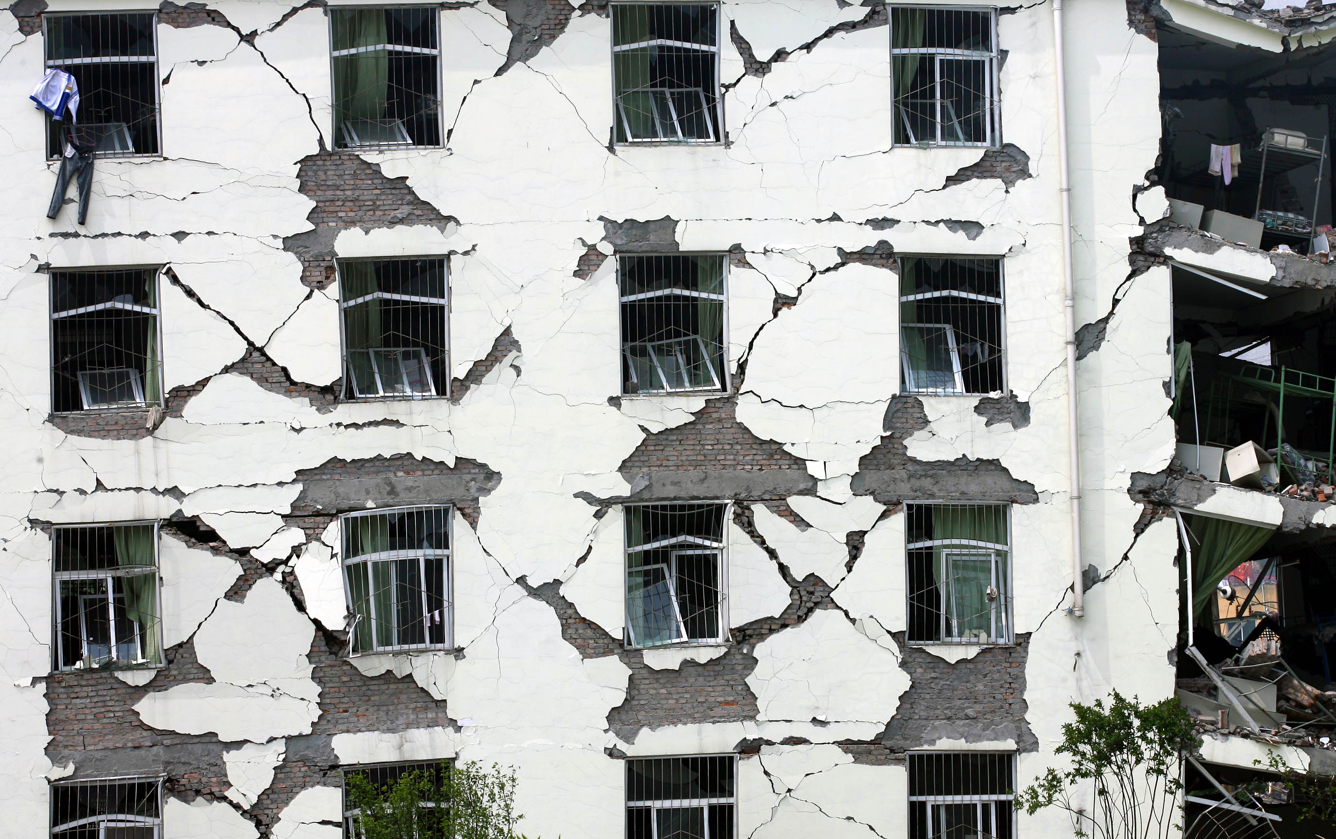 ▲2008年5月16日拍摄的汶川县映秀镇一所中学的宿舍楼。 新华社发(陈晓东 摄)