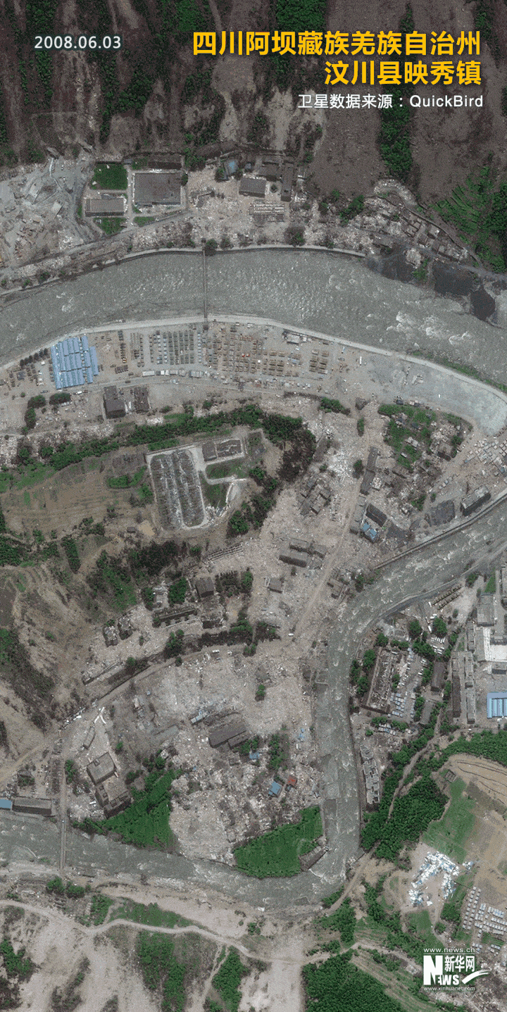 ▲拼版照片上图为2018年5月5日无人机拍摄的汶川县映秀镇风貌(新华社记者 刘坤 摄);下图为2008年5月14日拍摄的地震后汶川县映秀镇(新华社记者 陈凯 摄)。