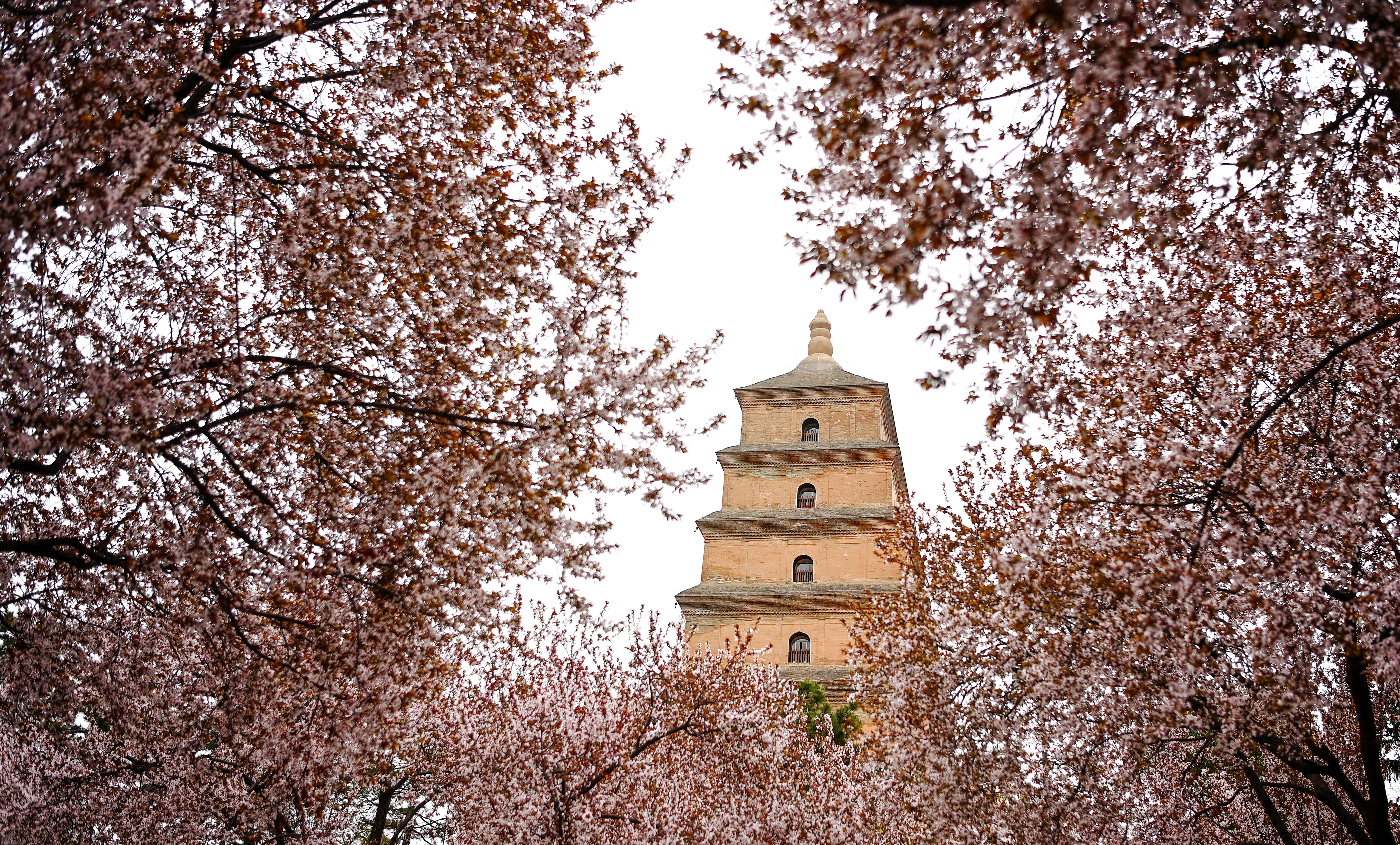 春花掩映中的西安大雁塔(4月1日摄)。新华社发(邹竞一 摄)