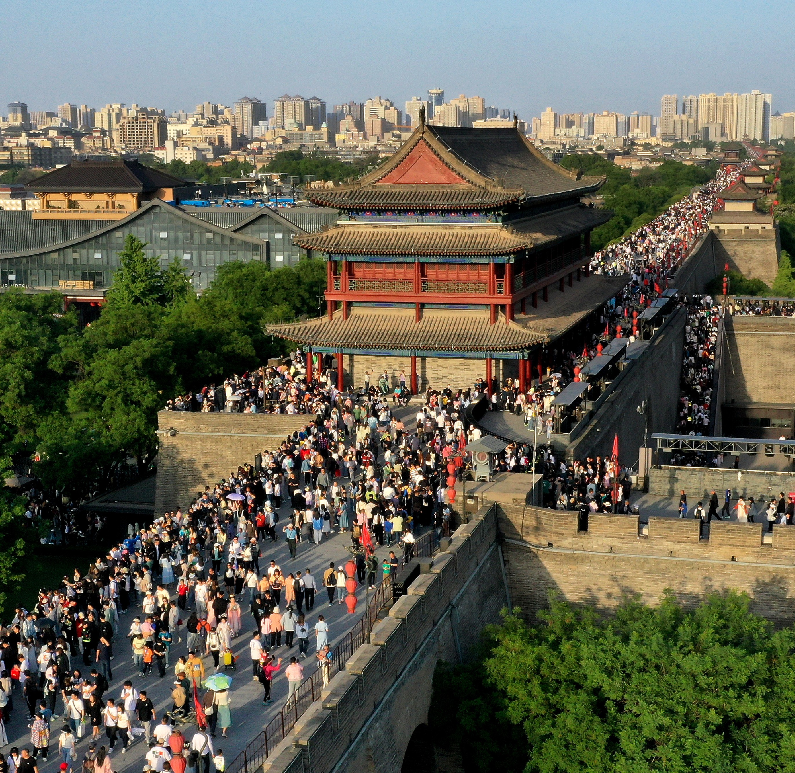 游客在西安城墙景区参观游览(4月30日摄,无人机照片)。新华社记者 刘潇 摄