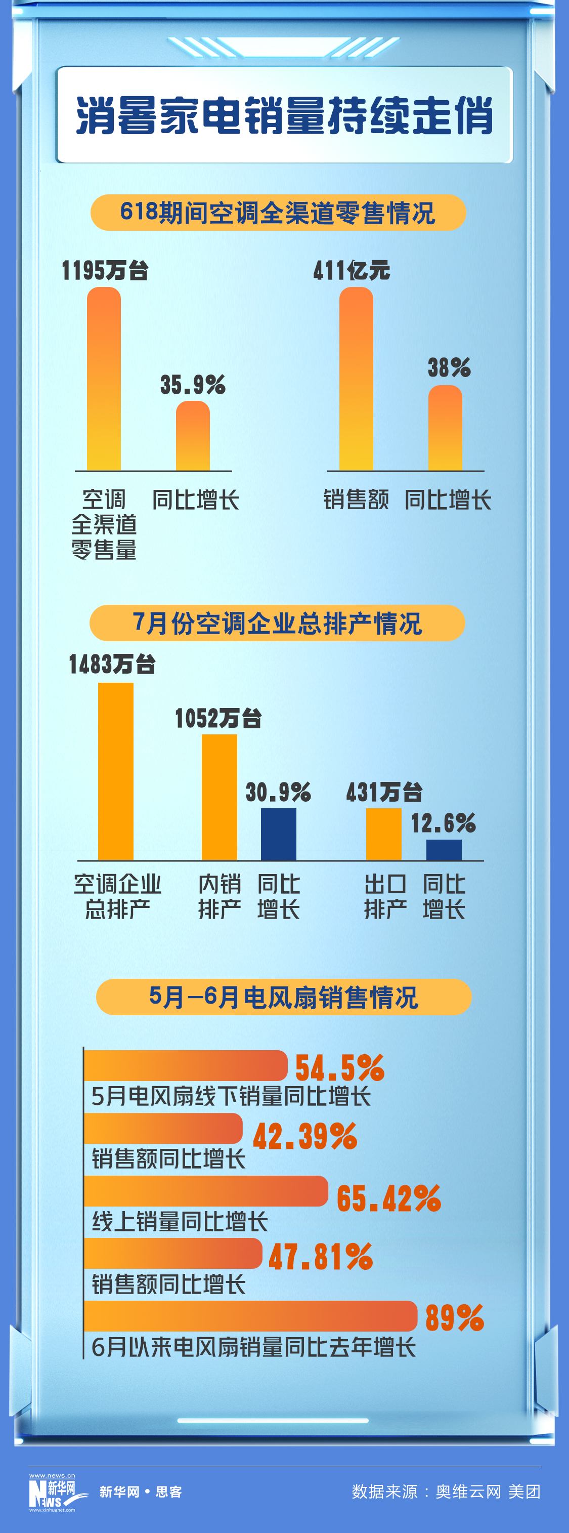 进入6月以来,气温逐渐攀升,连续的高温天气推高空调市场需求。据奥维云网(AVC)统计,今年“618”期间,空调全渠道零售量达1195万台,同比增长35.9%;销售额411亿元,同比增长38%。
