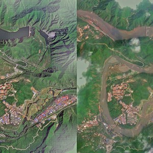强降雨前后的落坡岭卫星影像对比图