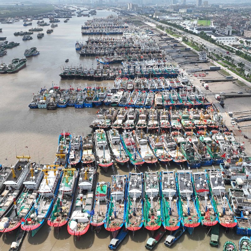 8月1日,推迟开捕的千余艘渔船停靠在舟山市沈家门渔港,防御台风侵袭(无人机照片)。新华社发(陈永建摄)