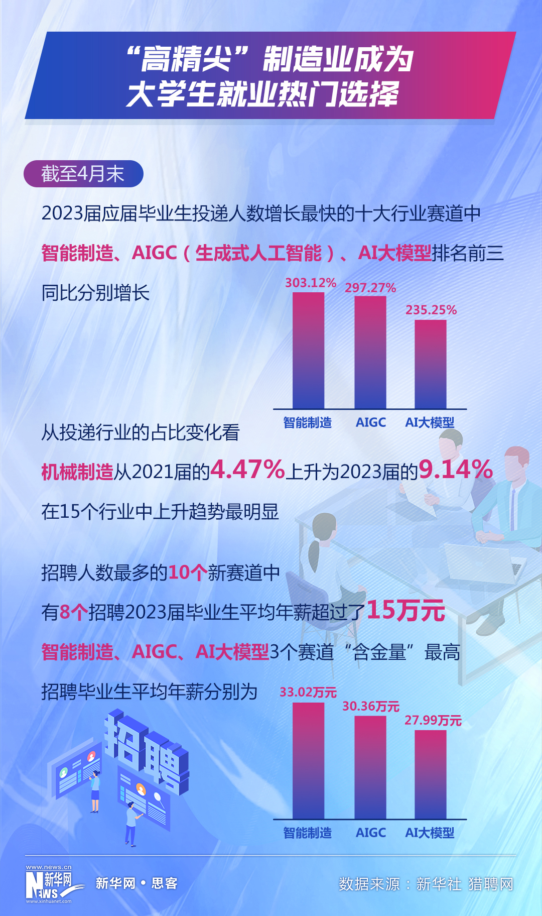 在今年高校毕业生规模继续增加的背景下,不少毕业生也选择早动手、广开路,将眼光更多地投向前沿行业和高科技领域。猎聘大数据显示,截至4月末,2023届应届毕业生投递人数增长最快的十大行业赛道中,智能制造、AIGC(生成式人工智能)、AI大模型排名前三,同比分别增长303.12%、297.27%、235.25%。从投递行业的占比变化看,机械制造从2021届的4.47%上升为2023届的9.14%,在15个行业中上升趋势最明显。