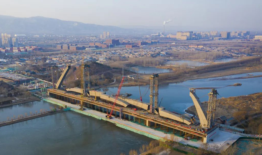 1月7日,临汾市区河汾一路跨汾河大桥项目施工现场。(苏亚兵 摄)