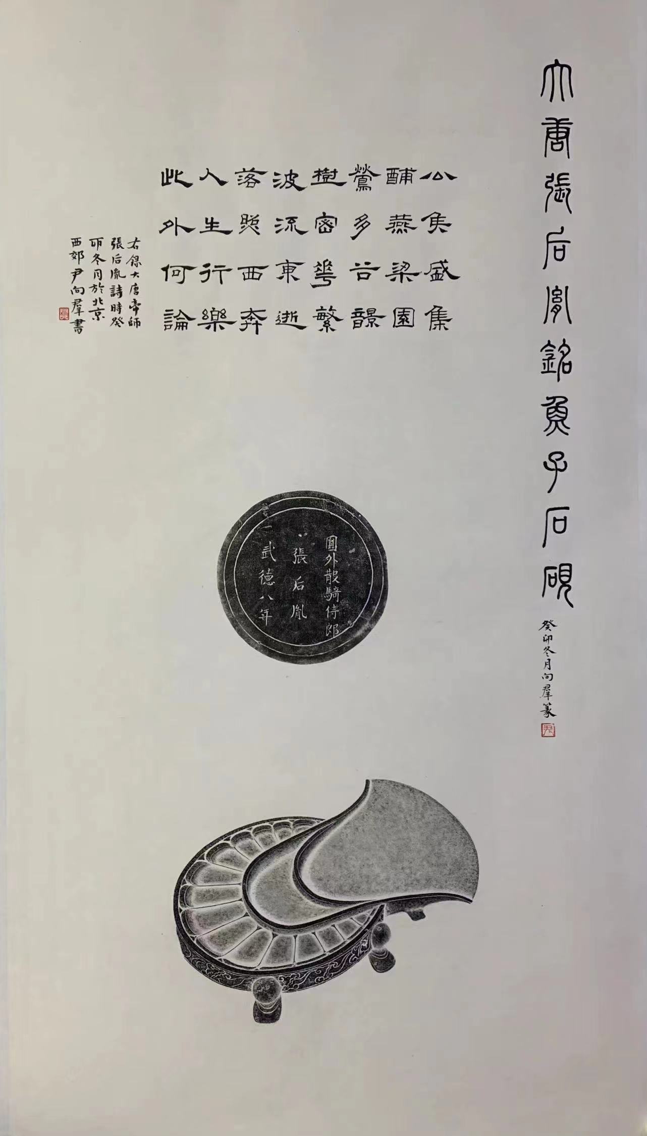 我们继续欣赏本砚后部的风字形部分。到了唐朝,辟雍砚的形式已经无法满足的大量书写的需要,凤形砚取而代之,逐渐成为了砚台的主流。而张后胤此砚集合两式之妙,是辟雍砚向凤形砚过渡的典型制式、代表器物。也体现了古典器物沿革发展中的进化与演变,展示出唐初石砚工艺承前启后的最高水平。本砚中间有一半月形砚池,其深度略高于砚堂,功能可能是贮墨或贮水。