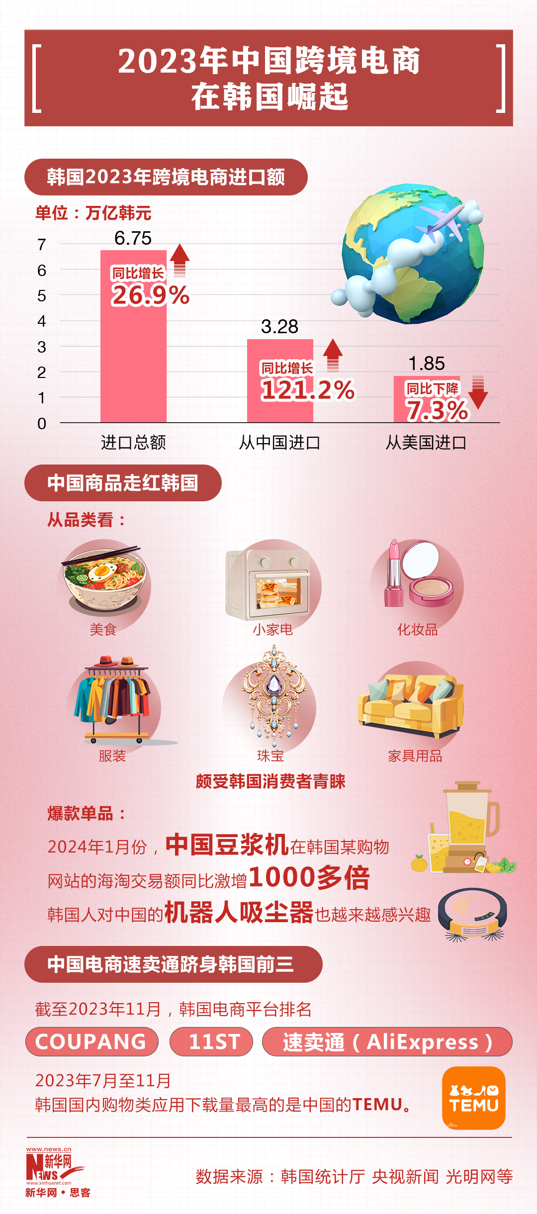 据韩国统计厅2月1日最新公布数据显示,2023年,中国首次超越美国,成为韩国最大跨境电商进口来源国。