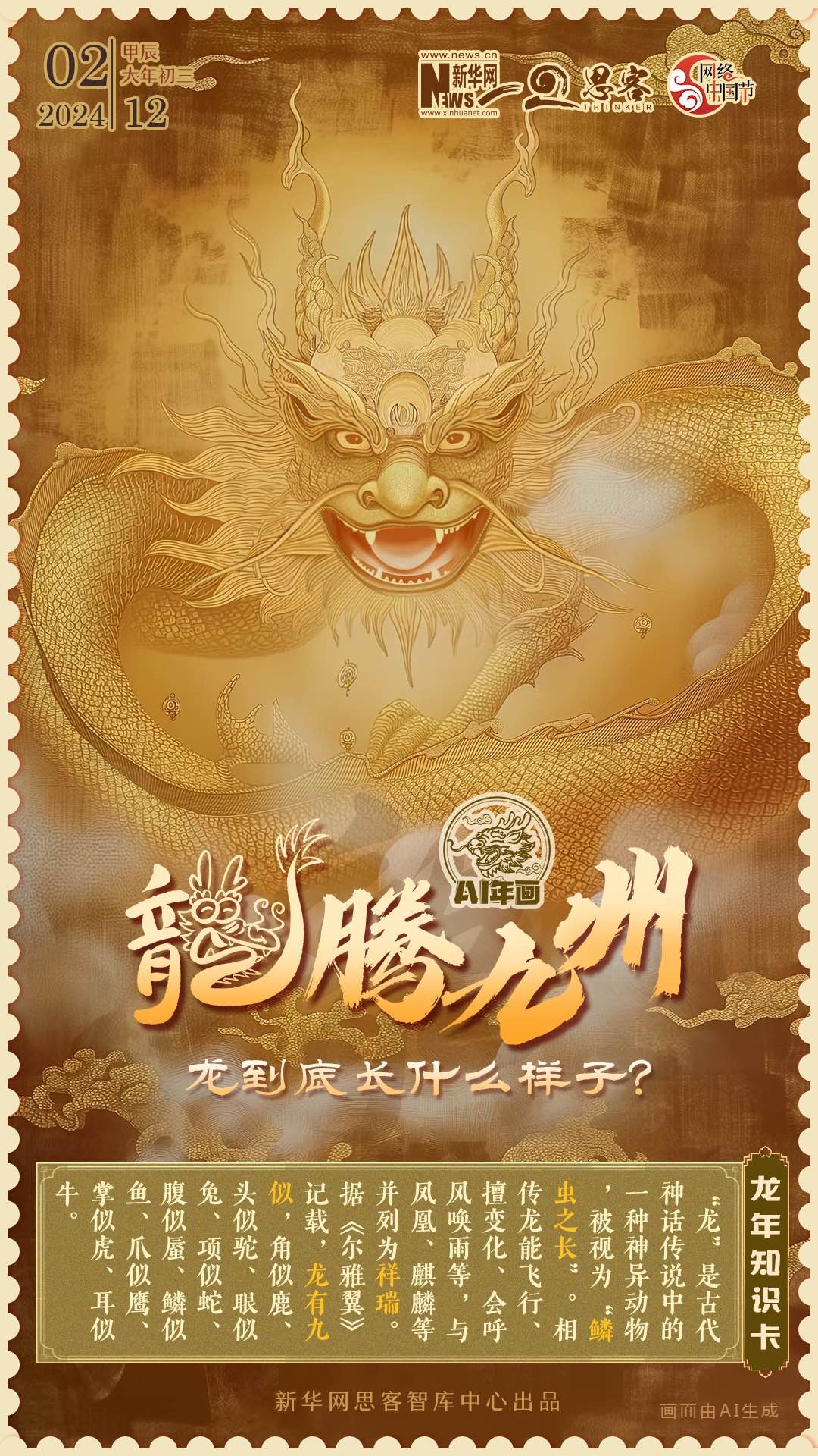 “龙”是古代神话传说中的一种神异动物,被视为“鳞虫之长”。相传龙能飞行、擅变化、会呼风唤雨等,与凤凰、麒麟等并列为祥瑞。据《尔雅翼》记载,龙有九似,角似鹿、头似驼、眼似兔、项似蛇、腹似蜃、鳞似鱼、爪似鹰、掌似虎、耳似牛。