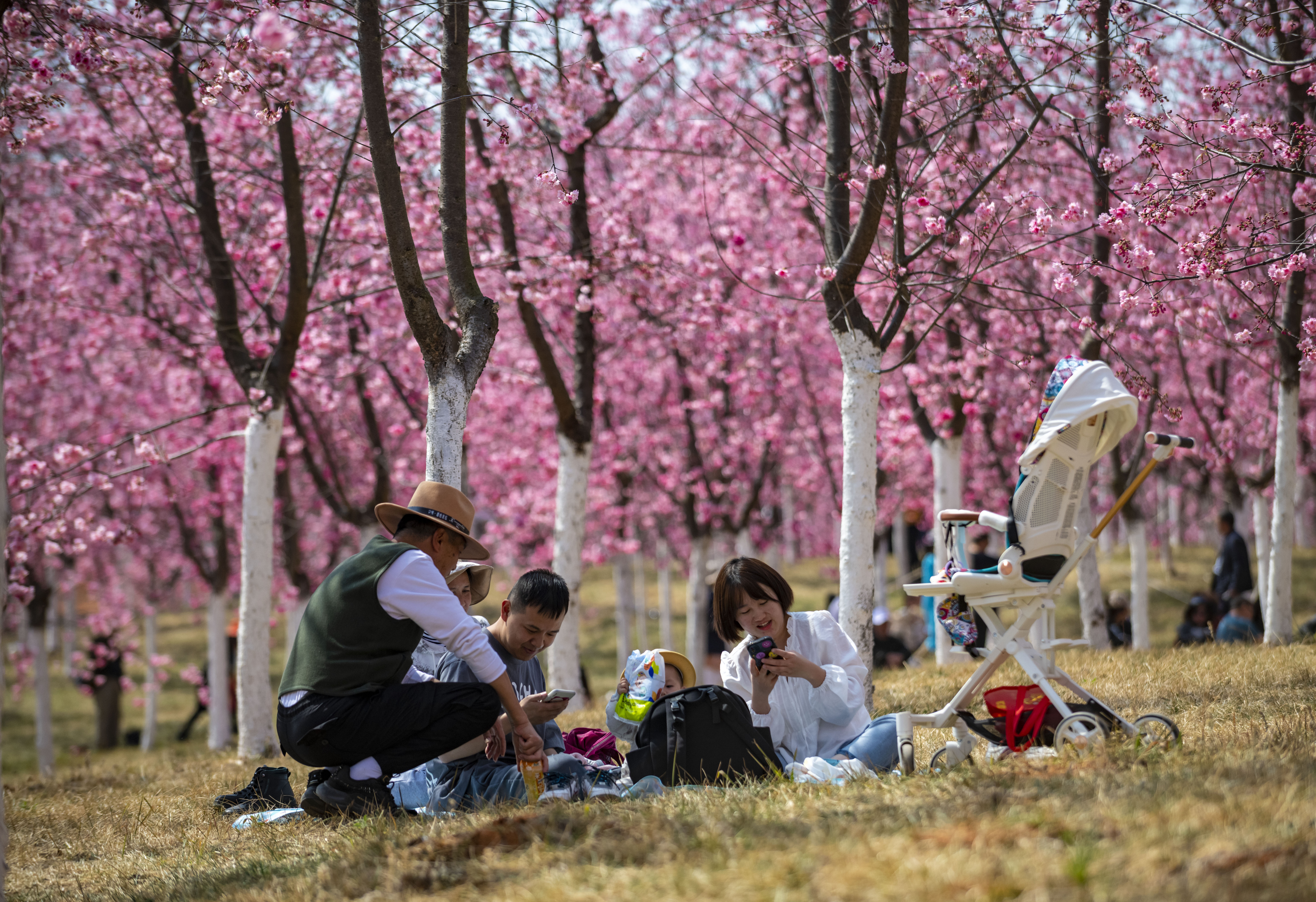 2023年3月1日,游客在宜良县山后樱花谷观光游览(无人机照片)。新华社记者 陈欣波 摄