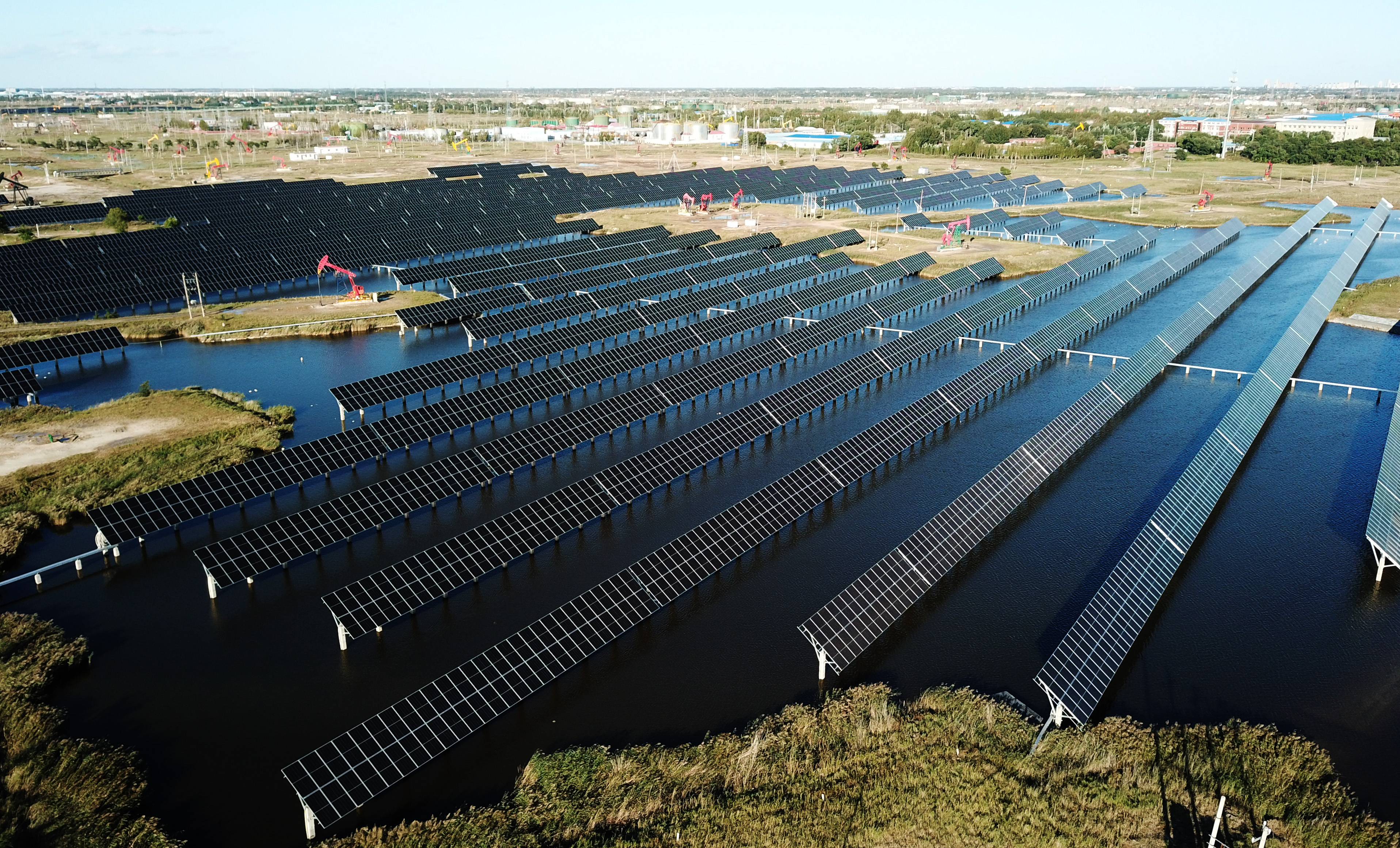 大庆油田星火水面光伏电站局部(无人机照片)。新华社记者 王建威 摄