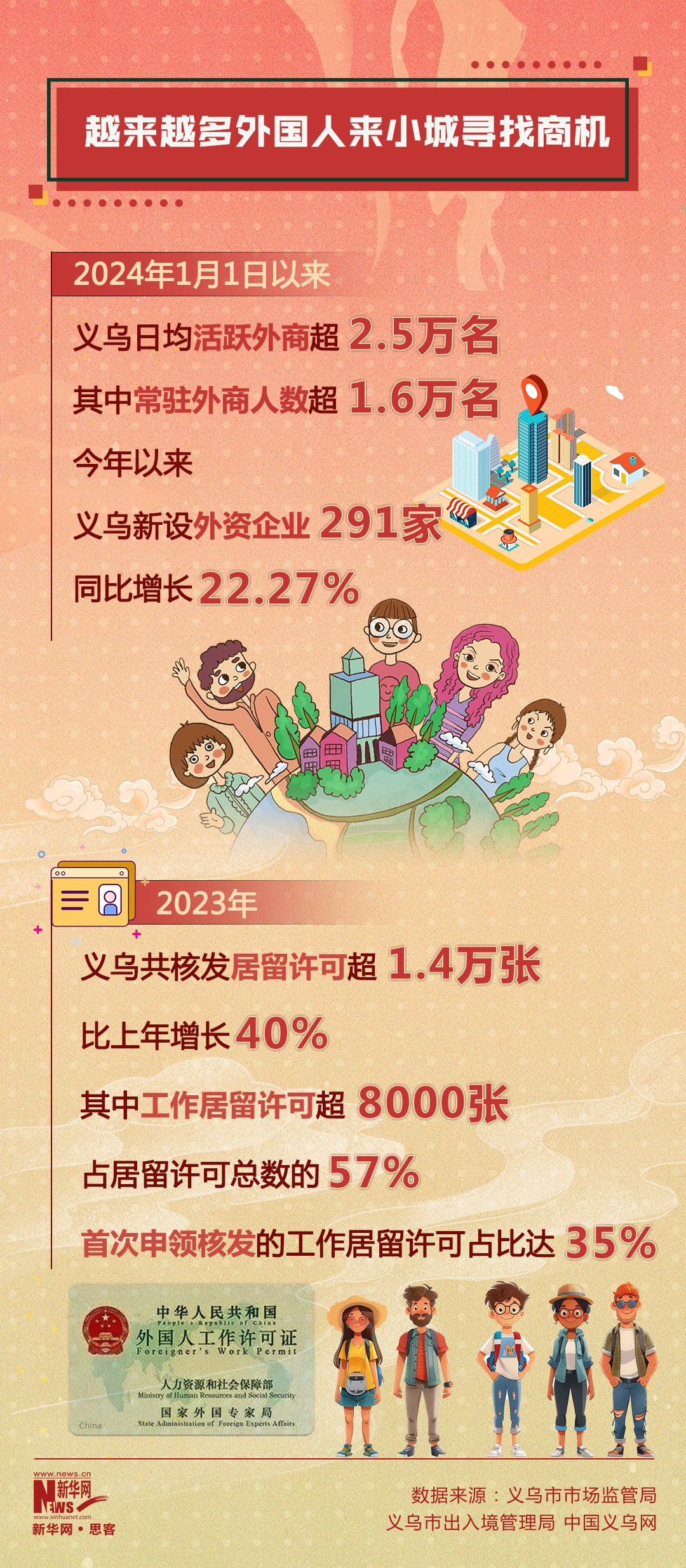 近年来,义乌不断优化营商环境,让外商在义乌的生活和工作更加便利。自2023年初实施《义乌市优化国际化营商环境涉外服务十项举措》以来,义乌持续加大涉外信息发布共享,为符合条件的外国人签发2—5年的居留许可,并推动实现投资类外国人注册企业、工作、居留“一件事”办理。数据显示,今年3月1日以来,日均在义乌外商已超过2.2万人。其中常驻外商人数达1.5万多人,较去年同期增长50%以上,在义乌的外商总数约占中国浙江全省五分之一。许多外商表示,义乌既宜业,又宜居。越来越多外商来此寻找机会,还有不少外商将家人接到义乌生活。数据显示,今年义乌国际商贸城开市以来,市场日均外商客流约3500人次。伴随他们到来的,是全新的订单和无限的商机。