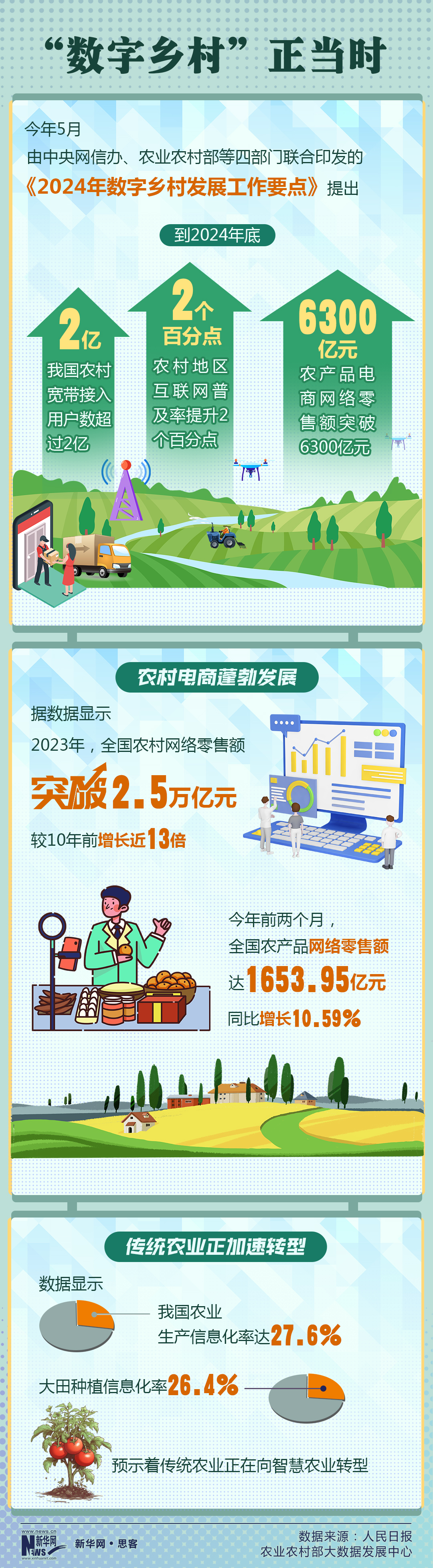 一根网线联通城乡。当前,我国数字乡村建设已进入一个全新的发展阶段。数字化发展在提升乡村居民生活品质、促进产业升级以及实现城乡共融方面发挥着重要作用,为乡村经济的发展注入了源源不断的崭新动力。