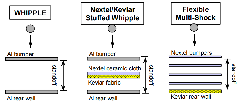 其他的Whipple改进型结构原理相近,都是将应对来袭整块碎片撞击的“硬抗”转化为更有效处理高能量碎片云团的各种方法,提升总的材料利用效率,或者说达到在实现同样防护效果的条件下总重量最轻。