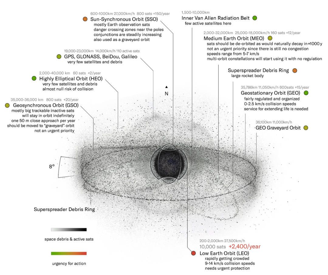地球不同轨道上的空间碎片态势(图源:Pablo Carlos Budassi/维基百科)