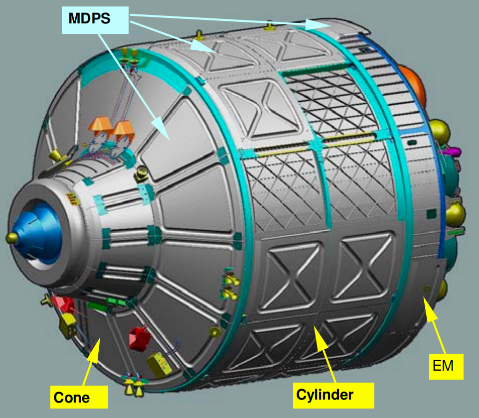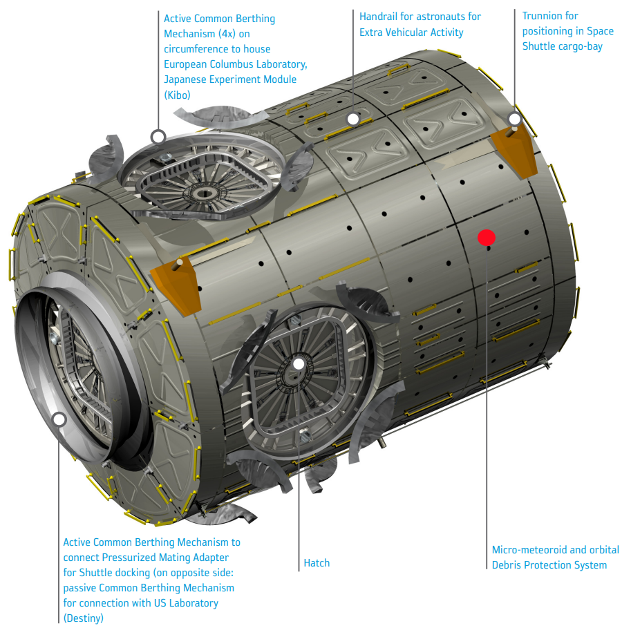 下图中红点所示的分片外壳,为国际空间站Node2(后命名为Harmony/和谐号节点舱)舱外的陨石碎片防护系统MDPS(Meteorite Debris Protection System)。2007年10月23日随发现号航天飞机发射升空的该节点舱,将美国命运号实验舱和欧空局哥伦布号实验舱、日本希望号实验舱连接在一起。