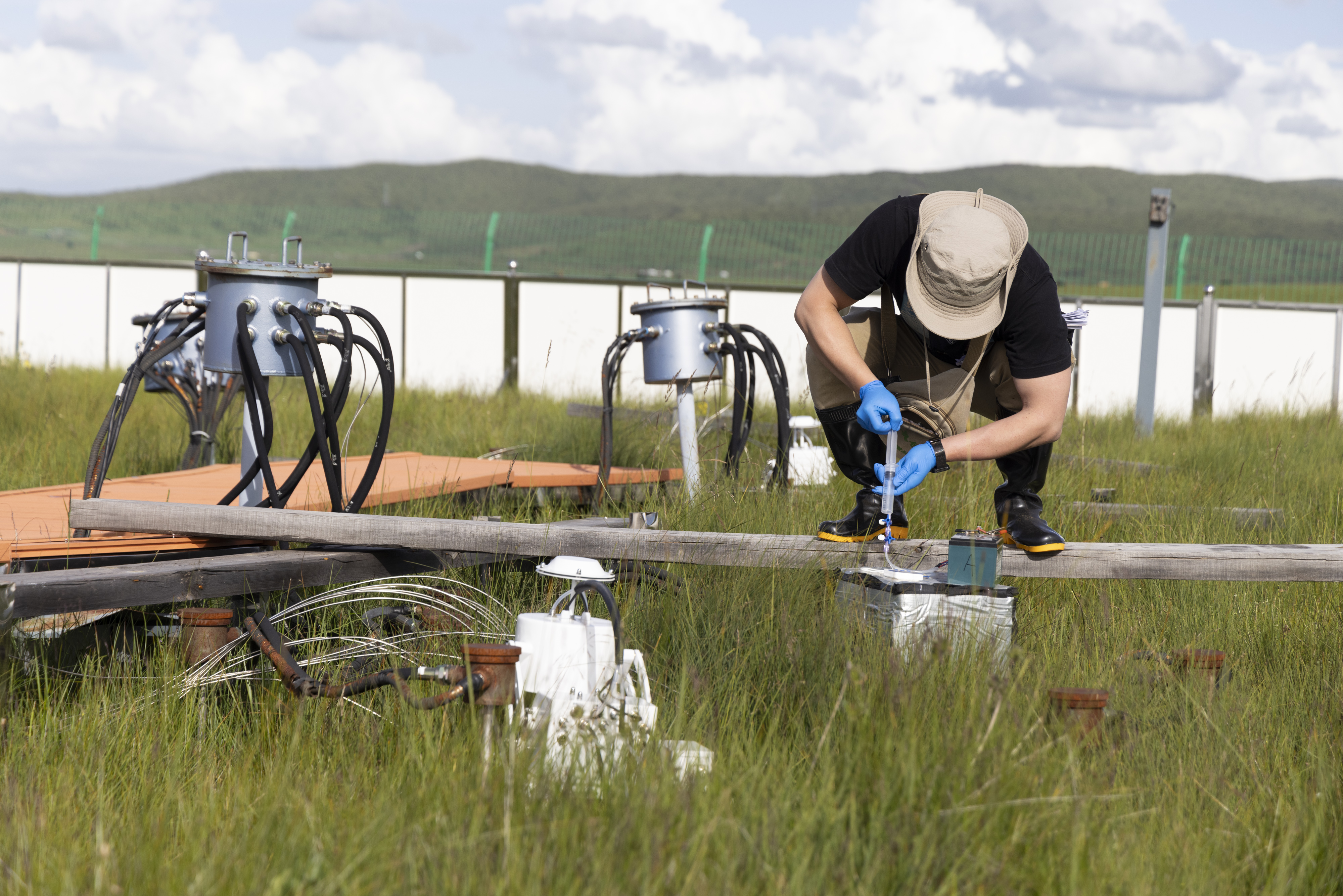 7月25日,科研人员在若尔盖日干乔湿地一处试验平台采取气体样本。新华社记者 金立旺 摄
