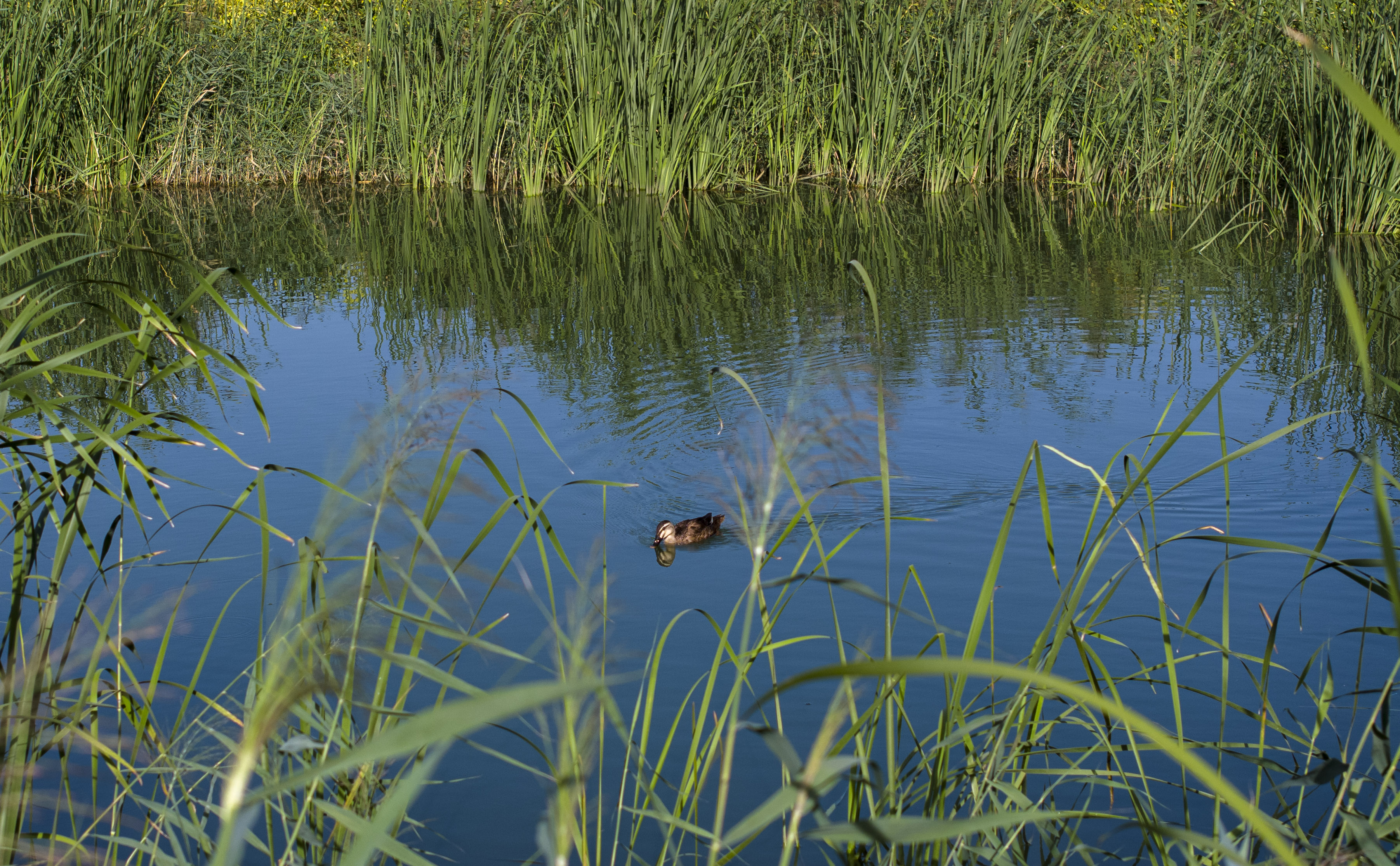 这是8月10日拍摄的位于宁夏吴忠市利通区的古城湾人工湿地内的野鸭(无人机照片)。新华社记者 任玮 摄