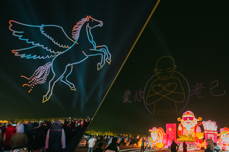鳌鱼、麒麟彩车组成的巡游队伍缓缓前行,演员扮作神仙精灵沿途抛洒祝福;千架无人机腾空而起,在夜空勾勒出飞马腾空、金龙摆尾的浪漫图案,“爱你老己”的字样更是让不少游客湿了眼眶;科技篝火旁,游客自发围成圈牵手欢唱,陌生人之间的距离在欢声笑语中悄然拉近。百姓才艺大比拼的舞台上,民间高手各展所长;相亲大会里,浪漫缘分悄然萌芽。有人收获掌声,有人邂逅美好。