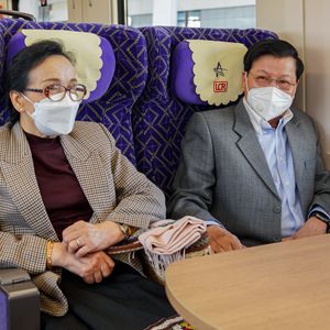 2月7日,老挝人民革命党中央总书记、国家主席通伦(左二)乘坐中老铁路“澜沧号”动车组。新华社发(李欢摄)