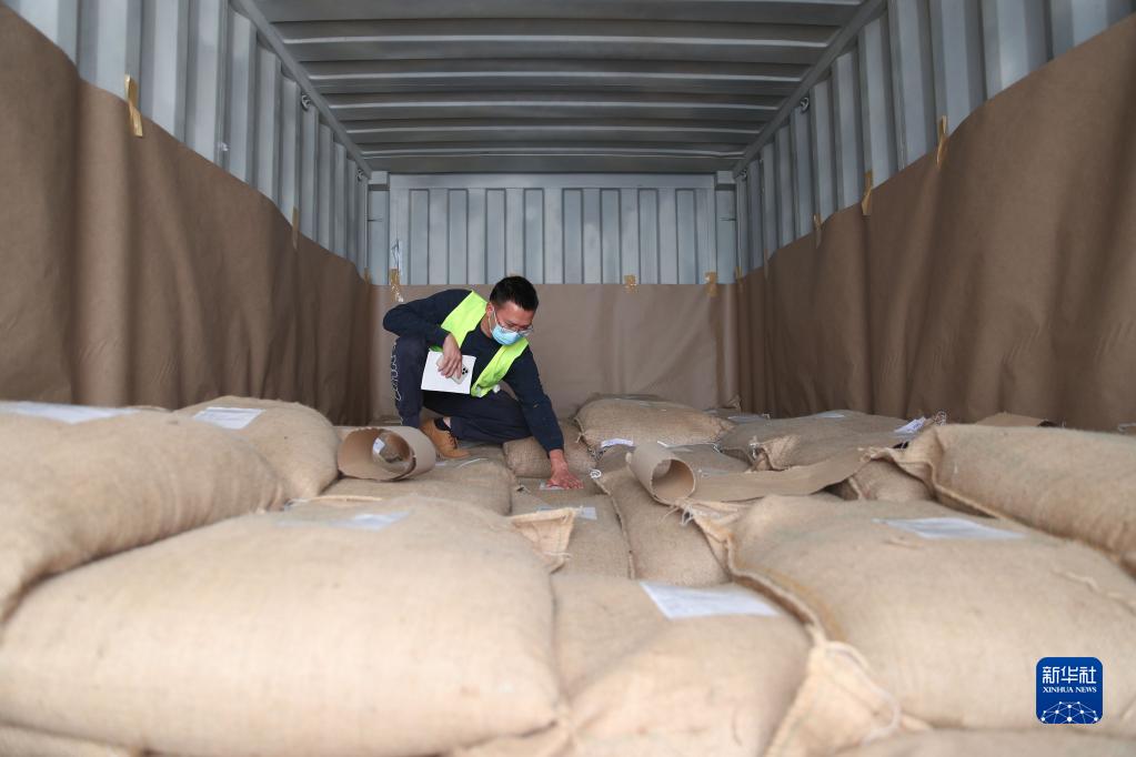 2021年5月26日,在肯尼亚内罗毕,中国青年张仁全在发货前为出口中国的咖啡贴上标签。