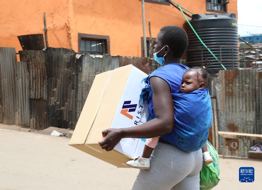 2022年2月22日,在肯尼亚内罗毕基贝拉贫民区,一名妇女领取中国公司非洲之星捐赠的食品后返回。