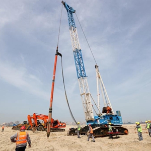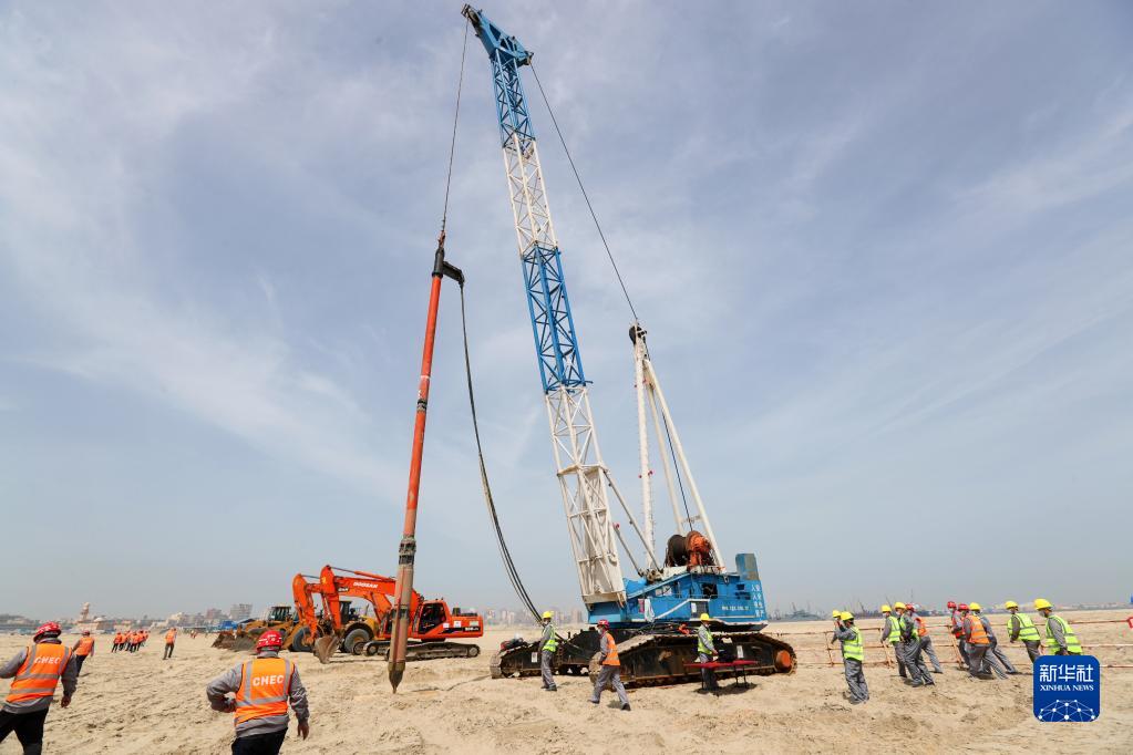 这是3月31日在位于埃及亚历山大的阿布基尔集装箱码头项目地基处理分项工程开工仪式现场拍摄的用于处理地基的强夯机。