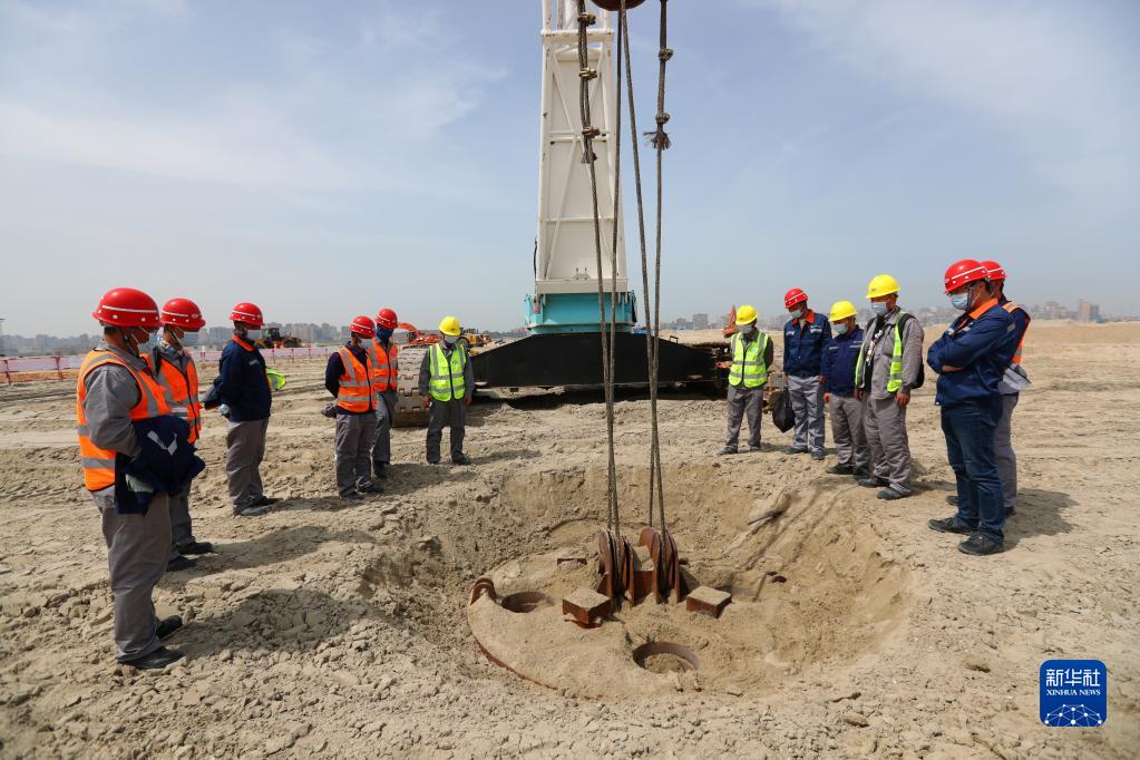 3月31日,在埃及亚历山大,工人在阿布基尔集装箱码头项目地基处理分项工程开工仪式现场查看强夯机处理地基效果。