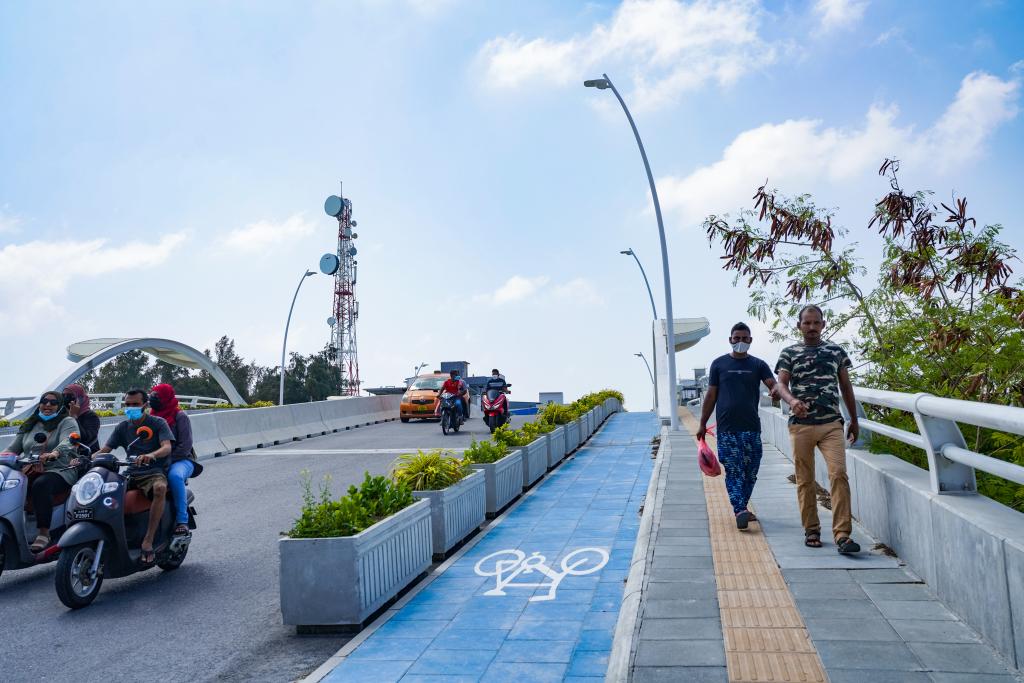 这是1月7日,人们在马尔代夫胡鲁马累的五桥项目中的一座桥上通行。新华社记者唐璐摄